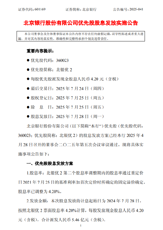7月17日金融一线消息,北京银行发布“北银优2”优先股股息发放实施公告,明确该优先股将于2025年7月28日派发股息。